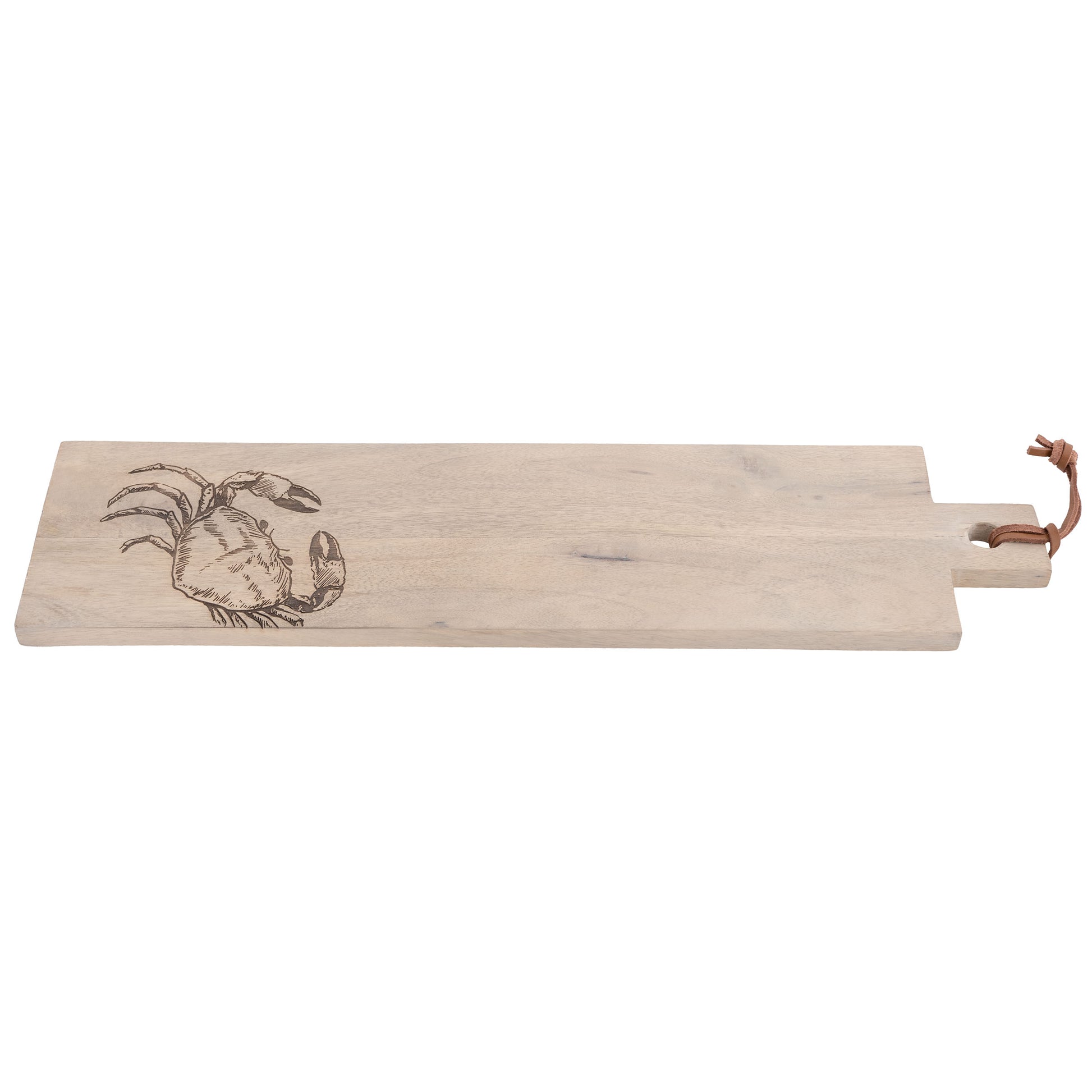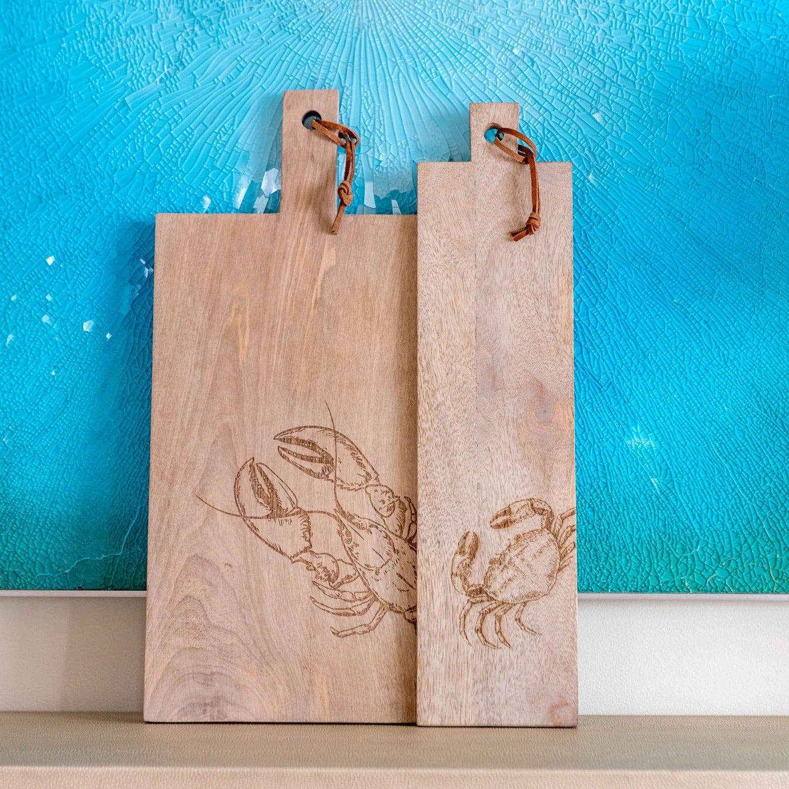 Our waterfront inspired cutting boards featuring crab and lobster designs are a funky and fun way to bring the sea a little closer. Made from mango wood and burnished with detailed imagery of shellfish, these cutting boards are perfect for serving up sea inspired fare. Each board features a leather hanging loop for easy displaying or storage and a unique shape for food prep or serving.