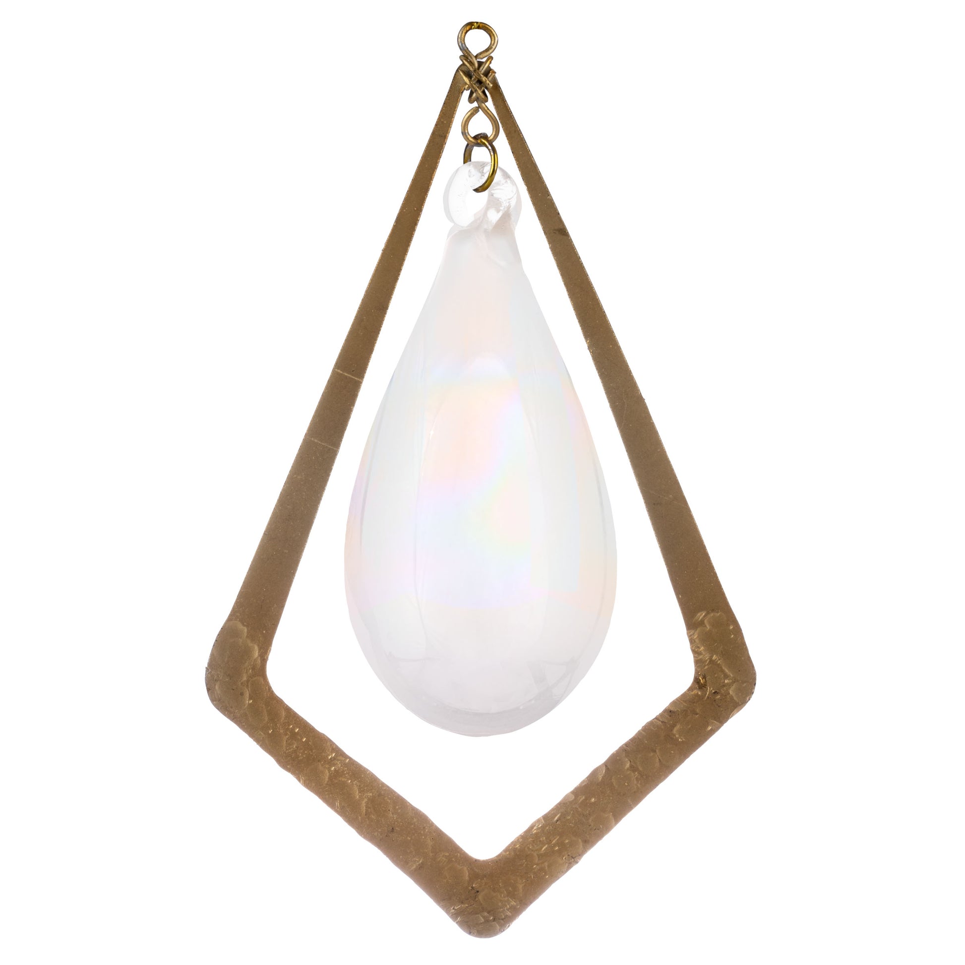 Glass ornament suspended in metal frame